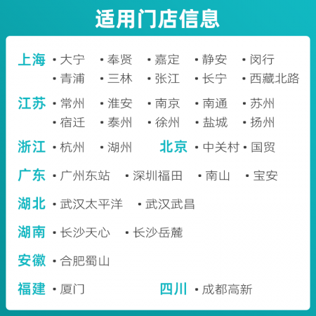 北京中关村,常州武进,成都高新,广州东站(天河),杭州钱江,杭州滨江、合肥蜀山,湖州,淮安,南京建邺,南京江北,南京江宁,南通北大街,南通滨江,南通海门,厦门,上海大宁,上海奉贤,上海嘉定,上海静安,上海闵行,上海青浦,上海三林,上海西藏北路,上海长宁.上海张江,深圳福田,深圳南山,深圳宝安、苏州姑苏,苏州园区,苏州高新,宿迁,泰州,武汉太平洋,武汉武昌,徐州云龙,盐城,扬州广陵,长沙天心、长沙岳麓