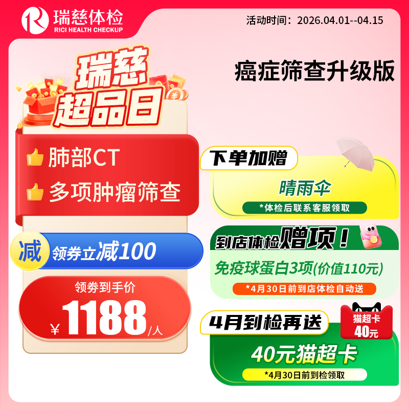 核心项目:肿瘤筛查 、肺部CT、甲状腺功能 、肝功能7项 、心肌酶谱等。男女通用 || 瑞慈全国门店通用