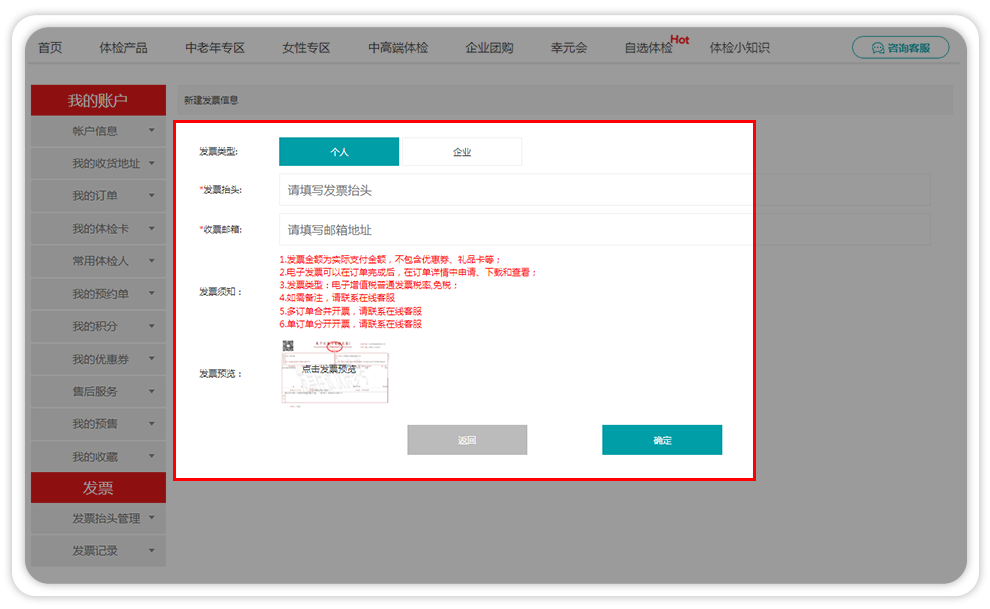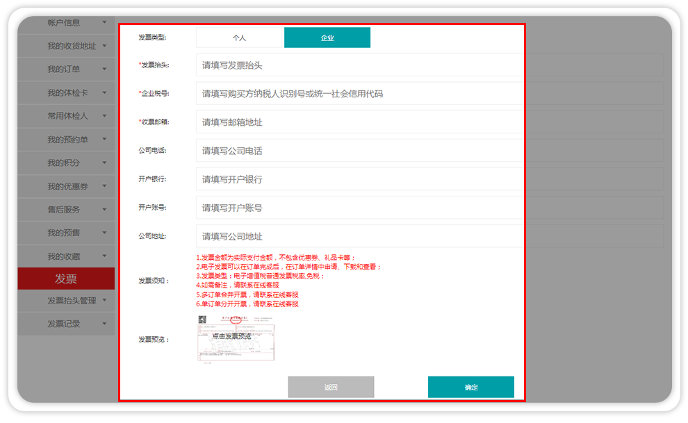4、根据您的需求选择个人或企业抬头,填写相关信息并点击“确定”