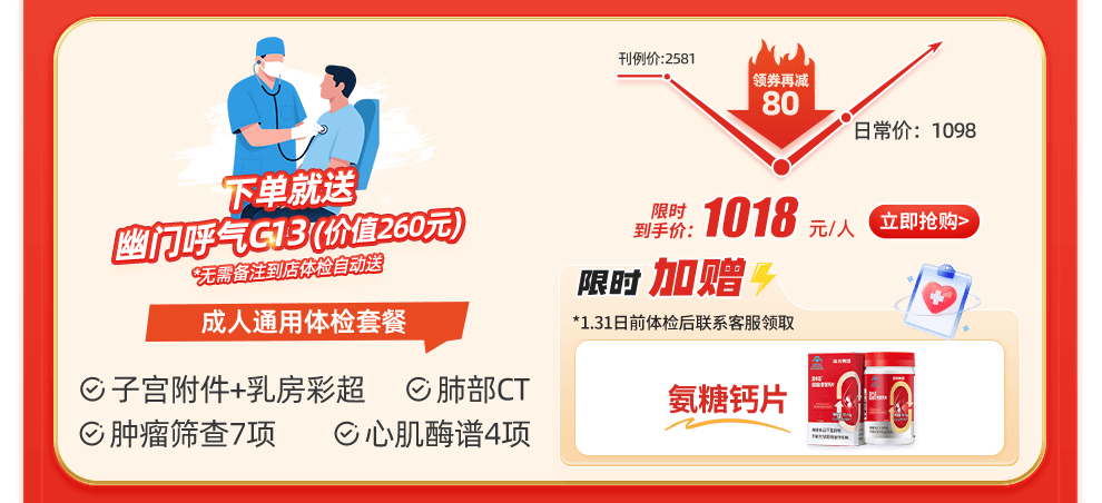 2. 活动期间购买【买1送1专区】套餐可享受买1送1优惠,送同款体检套餐,可获得2份体检卡密,花一份钱可2人体检;