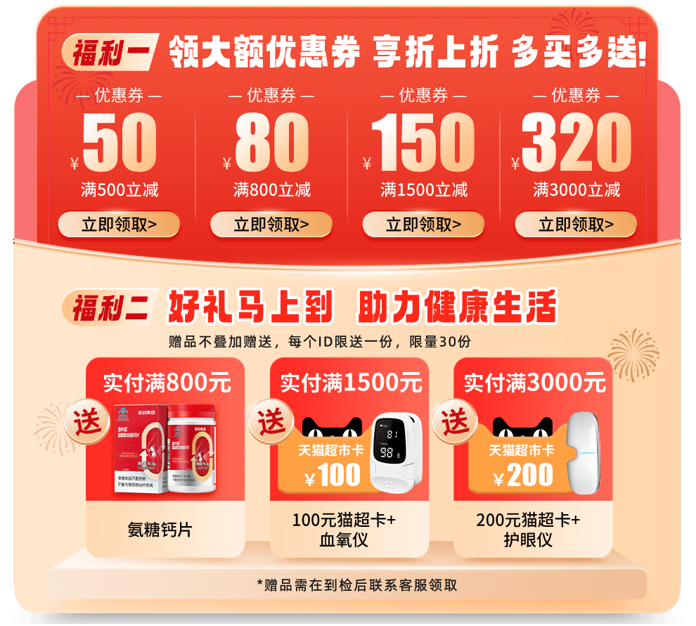 6. 活动期间单笔订单实付金额满800元送【氨糖钙片*1】限量30份,请在2026年1月31日前到检后联系在线客服领取!先到先得,每个ID仅限领取1份;