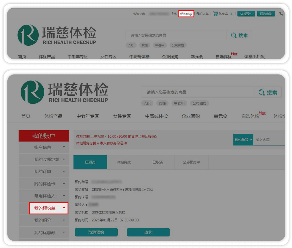 2、登录后,点击商城上方【我的瑞慈】并点击左侧列表栏 —【我的预约单】