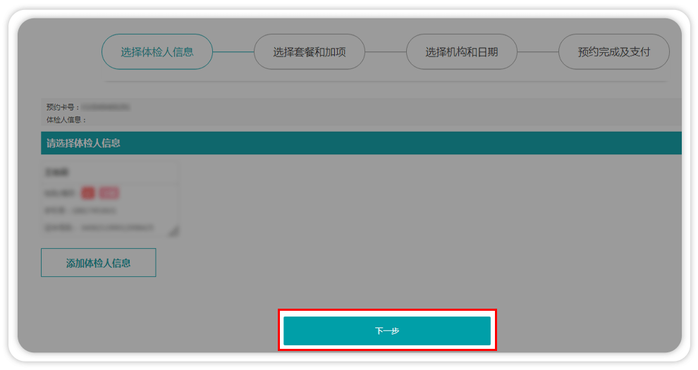7、如需添加多人信息可继续点击添加体检人信息,重复如上。体检人信息填写完整后,点击下一步