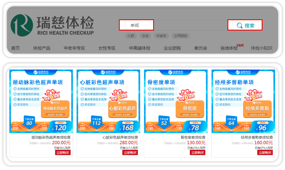 4、如官网单项卡无法满足需求,可体检当天现场加项。 【现场加项折扣】在瑞慈官网购买体检套餐可以享受现场加项6折优惠(除幸元会体检套餐以及特殊单项)具体 费用以门店前台为准。