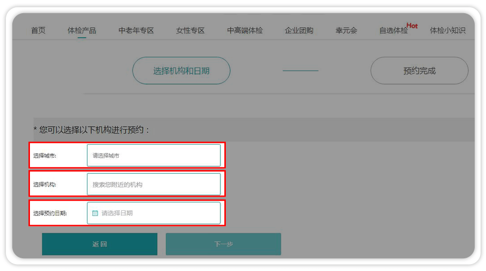 11、【选择城市、体检机构、预约日期、预约时间段】根据您自身的需求选择。确认无误,点击下一步。