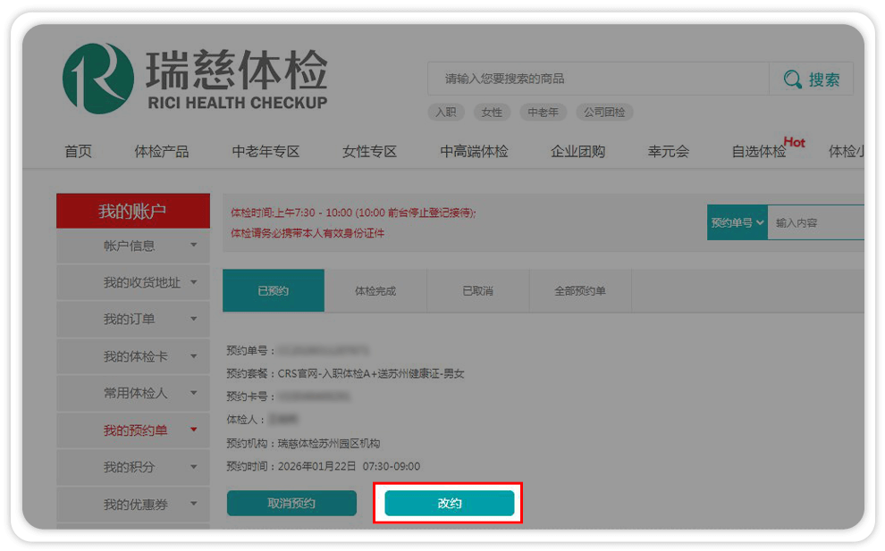 6、如需变更体检人信息(如:身份证号码,手机号码,体检人等),那么需要【取消预约】后重新预约。