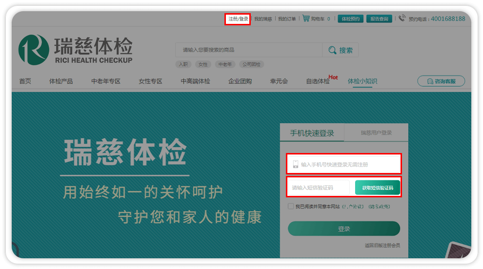 1、若您还没有瑞慈账号,请先注册瑞慈账号:https://www.ruicitijian.com/passport-login.html;可以选择手机快速登录,获取验证码登录